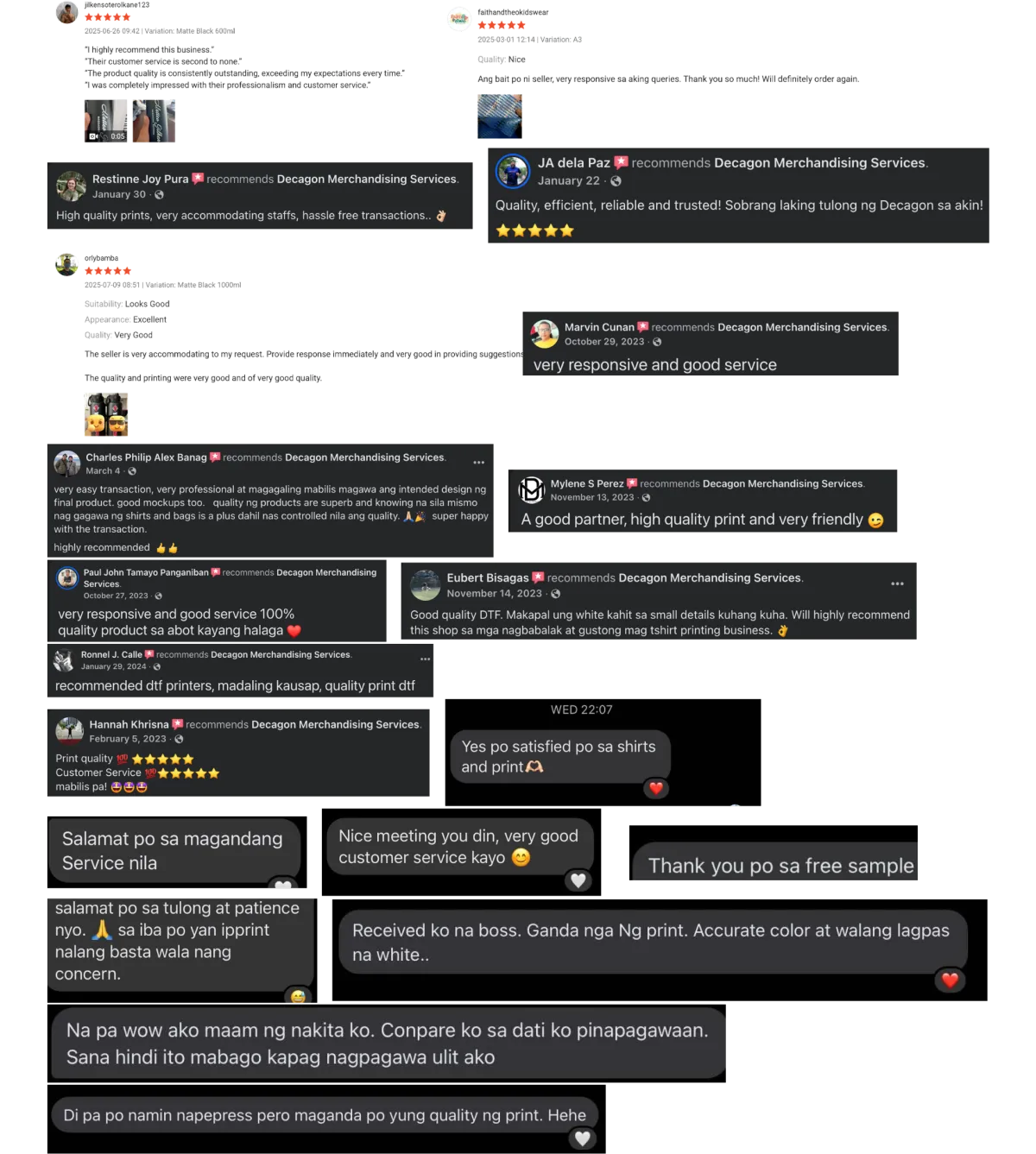At Decagon, we go beyond just delivering quality merch. We take pride in our customer service, our malasakit, and our ability to adapt to what each client needs.